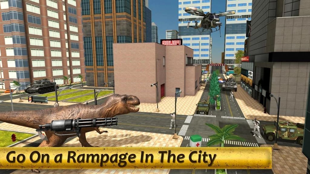 Get ready to demolish the city and dominate the battlefield in Fury of Dinosaurs – Arena, the ultimate dinosaur shooting game. Play as a massive, armed 3D dino equipped with powerful machine guns. Your mission is simple: shoot down waves of soldiers, destroy war tanks, take out helicopters and drones, and survive the chaos until the very end. If you take damage, quickly heal using your medikit and jump back into the action. Each level begins with a clear mission objective—complete it before time runs out, or risk losing the battle.